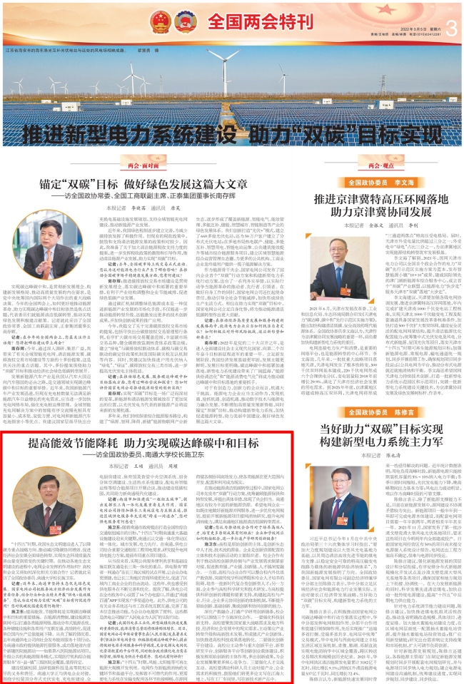 施衛(wèi)東:提高能效、節(jié)能降耗是實現碳達峰碳中和目標的重要措施。在能源消費側,建設能源互聯網可以打通各類能源網絡,推動分布式能源系統(tǒng)、各種儲能設施和各類用戶互聯互通、高效轉化,促進單位國內生產總值能耗下降。從我了解的情況看,去年南通供電公司向社會發(fā)布能效服務十項行動,為南通市政府提供能源托管服務,成功落地省內首個新建醫(yī)院能源站——如皋第八醫(yī)院能源站項目,升級公共機構能源服務模式,實現醫(yī)療機構綜合能源服務“市-縣-鎮(zhèn)”三級醫(yī)院全覆蓋,值得肯定。